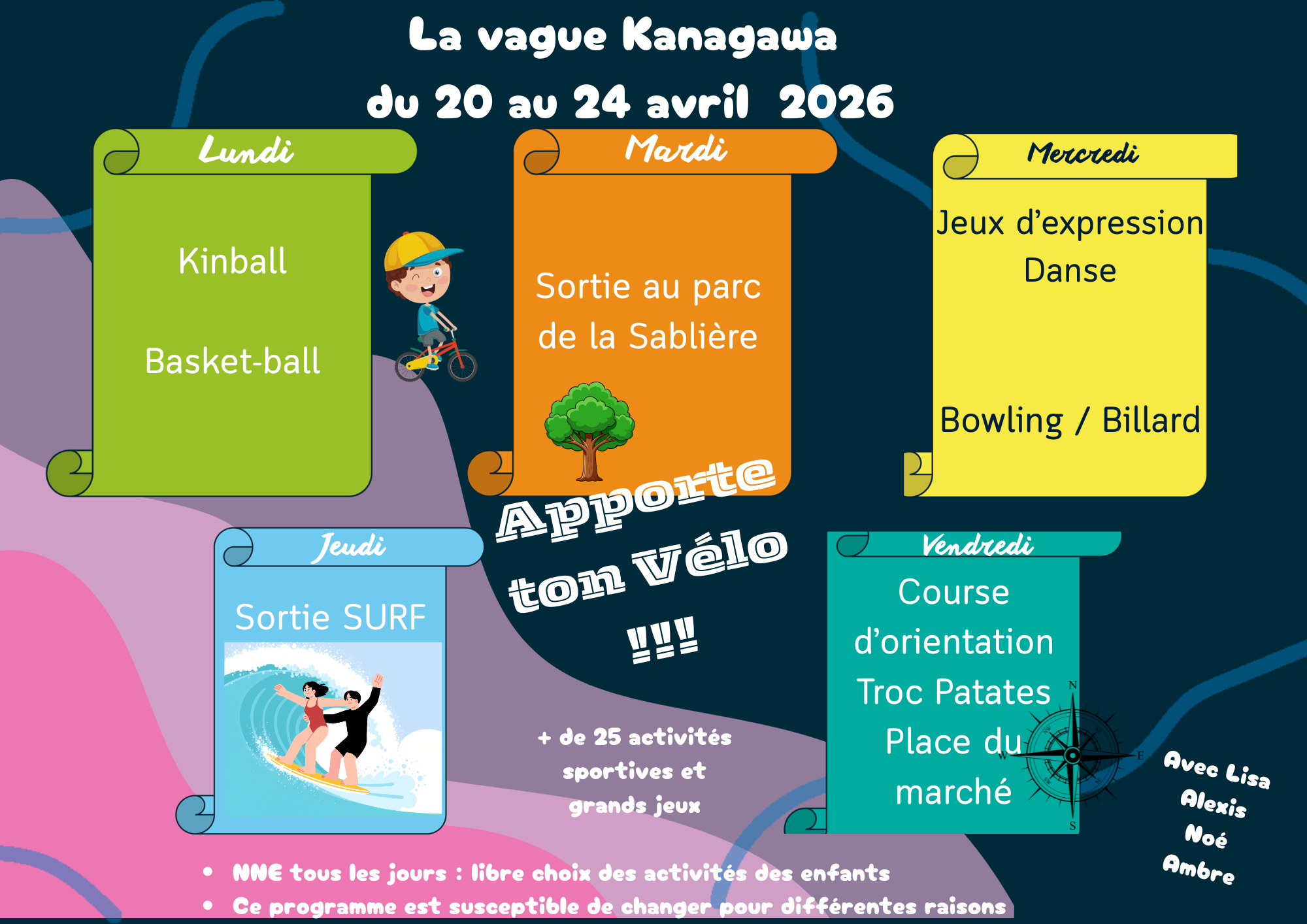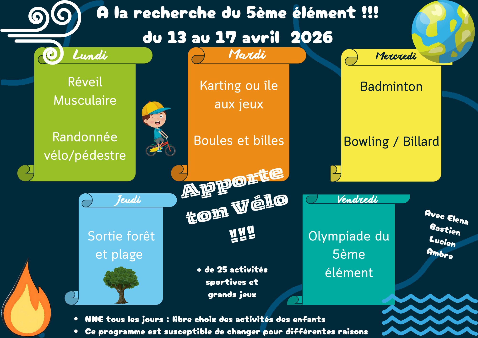 – Ton sac à dos (gourde, tenue de rechange) et gants ou maillot de bain selon le planning